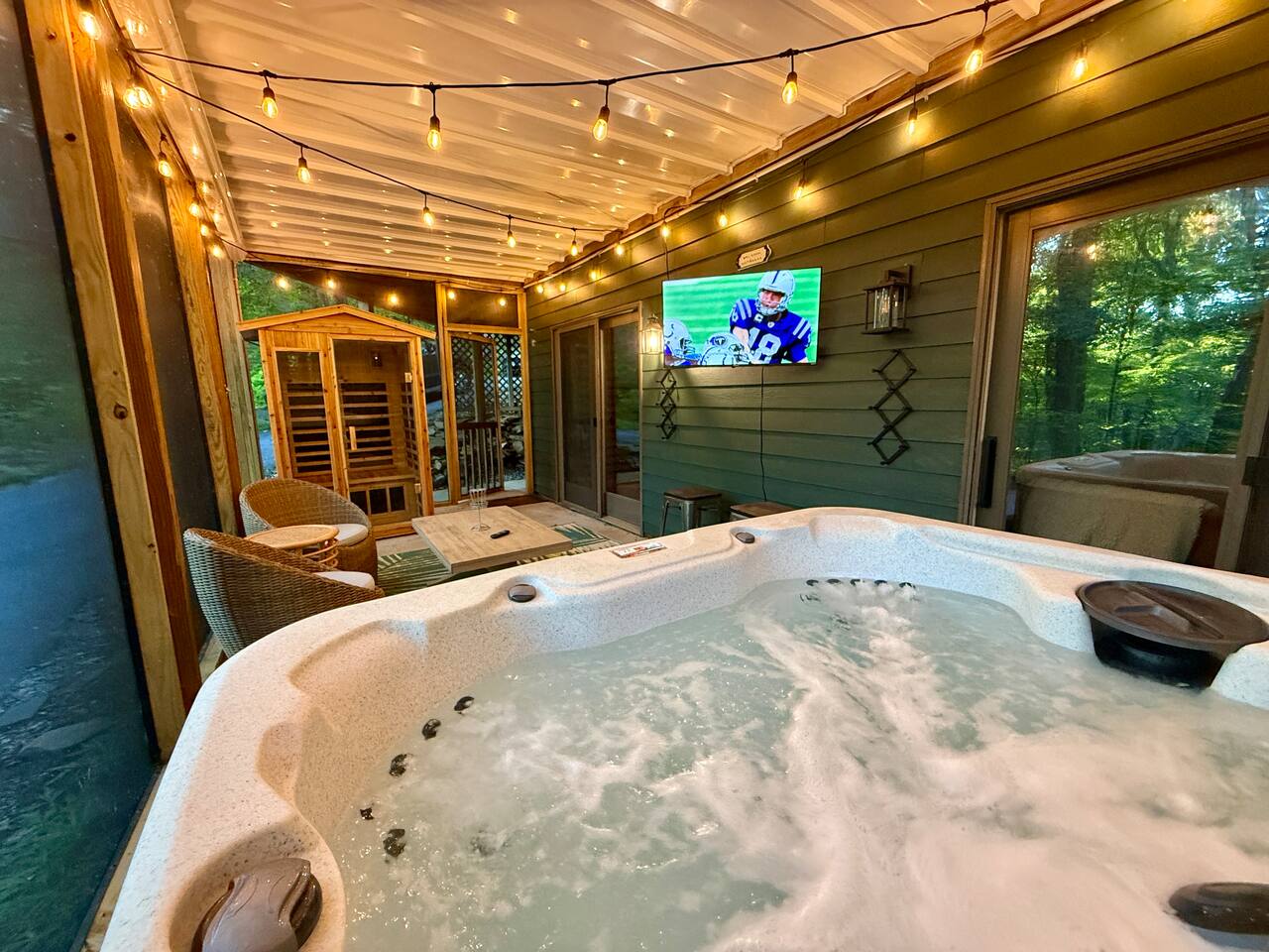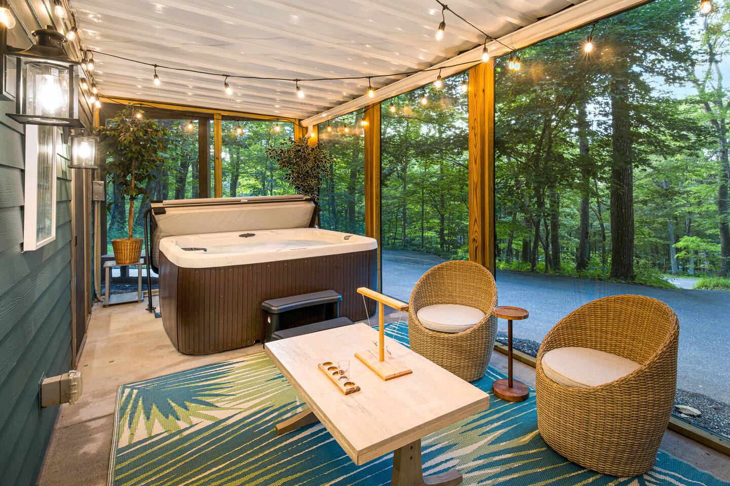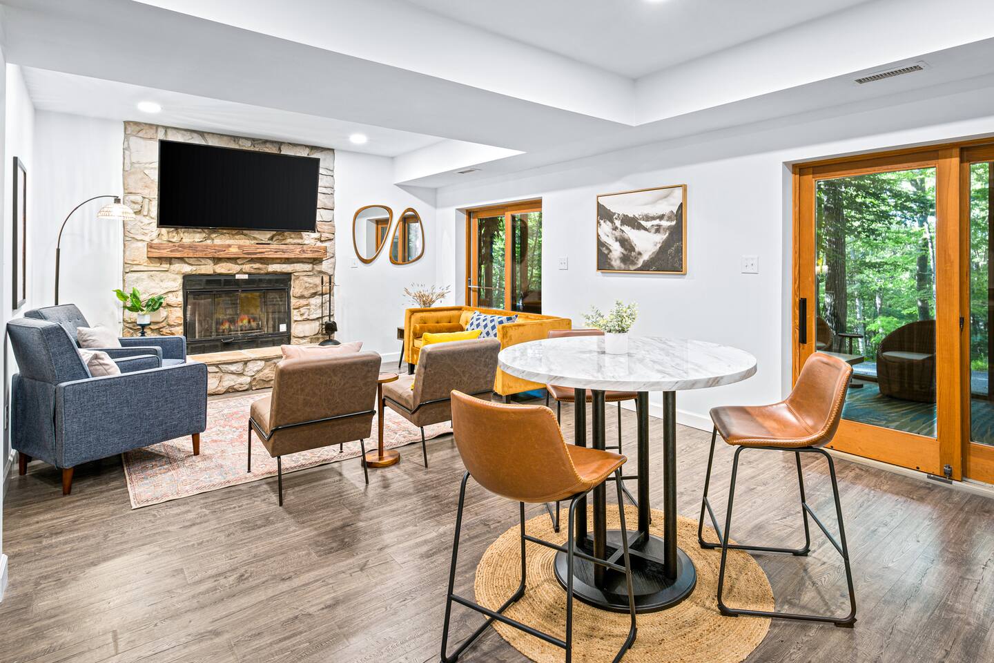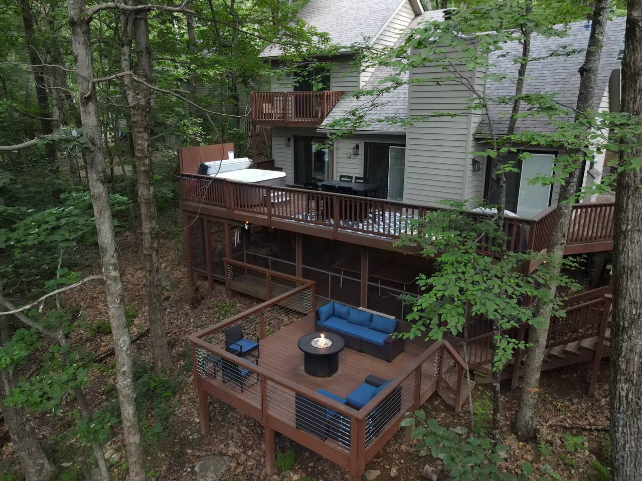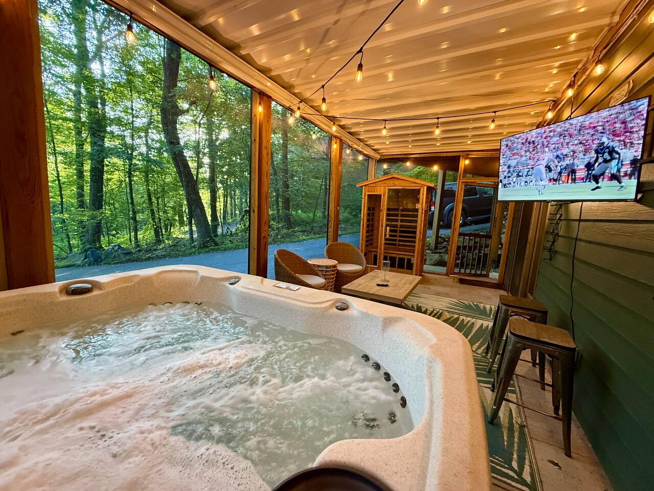 "Blue Ridge Bliss" is thoughtfully appointed to ensure your stay is enveloped in comfort: ✔ 2 Homes with plenty of space for large gatherings of friends and families ✔ Inviting great rooms with 3 ambient wood-burning fireplaces ✔ 2 Modern kitchens and a kitchenette, recently updated, complete with culinary essentials ✔ Multiple indoor and outdoor dining spaces with plenty of seating for everyone ✔ 4 bedrooms with king beds (2 with en suites) ✔ 3 secondary queen bedrooms that offer peaceful relaxation ✔ 2 playful bunk bedrooms that offer a fun space for the kids to relax. ✔ Hot tub and Sauna in screened in and covered patio accessible from the basement and an additional hot tub under the trees at Quisisana South ✔ Game room with Arcade games, Ring Toss game and Shuffleboard, additional screened in game room with ping pong, darts and foosball at Quisisana South ✔ Wet bar in basement with HD television and space to play cards ✔ Outdoor firepits with plenty of seating ✔ Tetherball and a Disc Golf hole for outdoor tournaments Guest access Unlock the full "Blue Ridge Bliss" experience with these exclusive features: ✔ Effortless check-in with keyless entry ✔ Expansive decks for leisurely outdoor moments ✔ Private hot tubs and sauna to unwind under the stars ✔ Gameroom with shuffleboard, darts and arcade games ✔ Exclusive screened in exterior game room for entertainment and fun (accessible via exterior staircase) Neighborhood Explore the enchanting surroundings of "Blue Ridge Bliss": ✔ Traverse the family-friendly Old Appalachian Trail for a nature adventure ✔ Engage in winter sports or golf, right at your doorstep ✔ Delight in local cuisine or indulge in a spa day nearby ✔ Immerse yourself in the vibrant local culture and outdoor activities Your mountain sanctuary awaits at "Blue Ridge Bliss" Book now and step into a storybook setting that's sure to become a cherished chapter in your life's adventures.