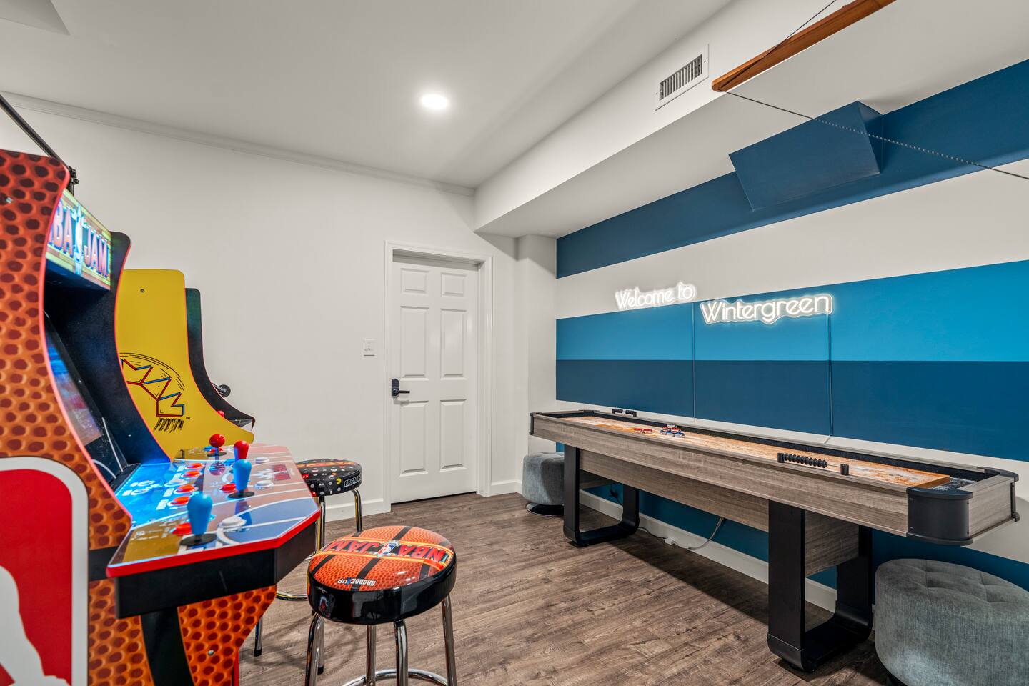 Discover Blue Ridge Bliss Across Two Homes: Welcome to Wintergreen Resort! Experience the ultimate retreat with two homes across the street from one another: Pleasant Point, a 6-bed, 4-bath luxury escape with hot tub, sauna, game room with shuffleboard and arcade games, and more; and Quisisana South, a cozy 3-bed, 2-bath cabin with a hot tub, ping pong table and outdoor firepit nestled in serene woods. Perfect for family reunions, weddings and events in the heart of the Blue Ridge Mountains.